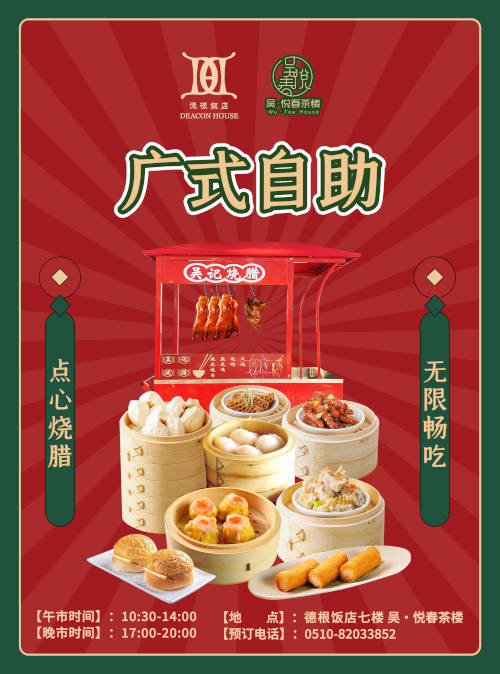 吴·悦春茶楼推出广式自助,各式点心、烧腊等手工精制,无限畅吃,让您尽享各式美味。